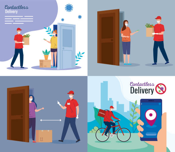 set scenes of safe contactless delivery courier by covid 19 vector illustration design