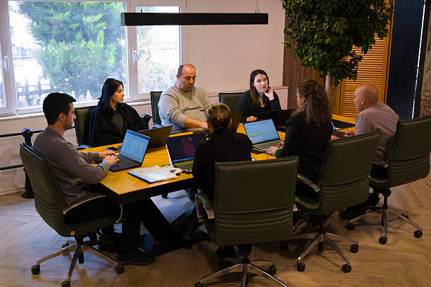 A group of coworkers having a meeting in the meeting room of a ready-made garment textile product manufacturer company