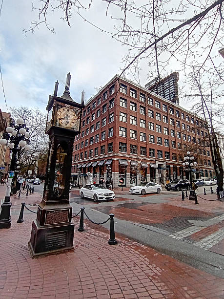Vancouver, British Columbia, Canada - Mar 15 2022: The Vancouver Steam Clock, located in Gastown, is a steam-powered icon of the city that emits a whistle every 15 minutes and a melody on the hour