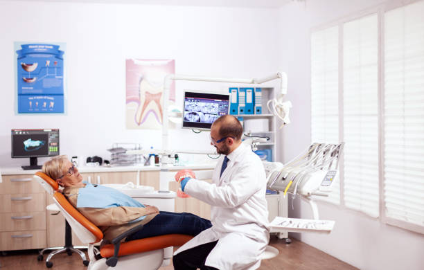 Dentist explaining oral hygiene holding model of cavity during consultation of senior woman. Medical teeth care taker discussing with senior woman about mouth hygiene.